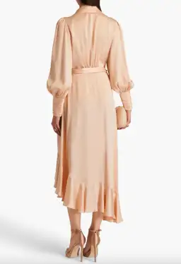 - The Silk Wrap Midi Dress in Peach from the Zimmermann Spring 2023 Collection, Wonderland. A silk midi dress featuring a wrap front silhouette, blouson sleeves with elongated cuffs and asymmetric skirt