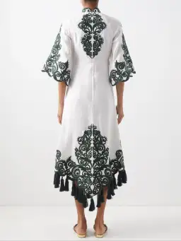 Zimmerman accentuates the fluidity of this white embroidered linen Anneke dress with wide sleeves and a handkerchief hem trimmed with green tassels.
