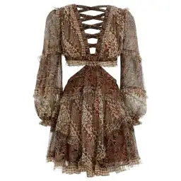 Zimmermann Spliced Tali Batik Cut Out Dress. Size 2. RRP $995. Mini length. Spliced paisley print. Frill detailing throughout. Lace up back. Deep v-neckline. Cut out detailing. Cut out waist. Long blouson sleeves. Ruffled skirt. Lined bodice and skirt. 100% silk.