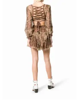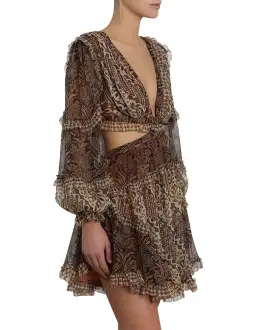 Mini length. Spliced paisley print. Frill detailing throughout. Lace up back. Deep v-neckline. Cut out detailing. Cut out waist. Long blouson sleeves. Ruffled skirt. Lined bodice and skirt. 100% silk.