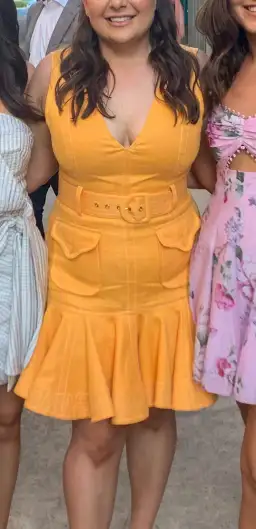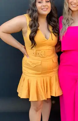 Mango yellow linen Super Eight Safari mini dress from Zimmermann. Featuring a v-neck, a sleeveless design, a belted waist, a front buttoned flap pockets, a ruffled hem and stitching details.