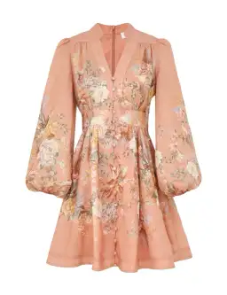 The Tallow Plunge Mini Dress in Pink Multi Floral from Zimmermann's Resort Swim 2025 Collection. A linen mini dress featuring a plunging V-neckline and exaggerated sleeves, finished with buttons down the centre front.