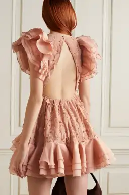 Every last detail of Zimmermann's Dancer dress is done to perfection, from the crochet appliqués to the lustrous embroidery that outlines each cutout. It's made from blush georgette and has voluminous linen and silk-blend ruffles along the sleeves and hem. The open back reveals an unexpected flash of skin.