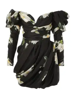 A silk satin mini dress featuring a boned bodice with off the shoulder sleeves, finished with draped detailing throughout.