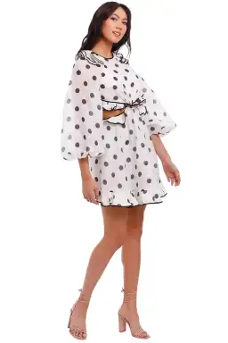 Adore the ethereal Lovestruck Frilled Mini dress by Zimmermann, featuring a stunning polka dot print, cutout waist, ruffle detailing, and a self-tie open back. This dress is a dreamy choice for your upcoming birthday party or daytime event. It's made from Silk Linen Organza and includes blouson sleeves with elasticated cuffs and a frilled hem for added charm.