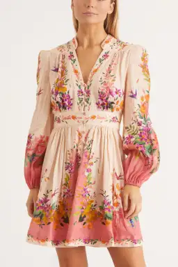 The Zimmermann Tropicana Plunge Mini Dress features their signature fit and flare silhouette. You'll love the tropical floral print paired with the button down front and blouse sleeves for a feminine touch.