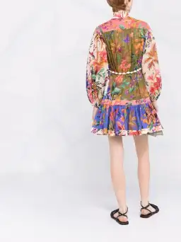 Multicolour cotton Tropicana print belted mini dress from ZIMMERMANN featuring belted waist, high neck, front button fastening, long puff sleeves, buttoned cuffs, tiered skirt, pleated skirt, signature Tropicana print and sea shell embellished belt.