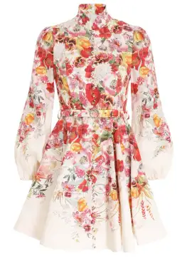From Zimmermann Spring 2023 Collection, Wonderland. A linen mini dress featuring a stand collar and exaggerated sleeves.