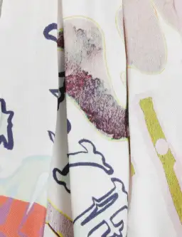 Midi length. Plunging v-neckline. Blouson long sleeves. Elasticated cuffs. Fun word print throughout. Side seam pockets. Lined. Invisible zipper at centre back. Silk; wool blend.
