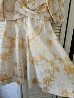 A linen mini dress featuring a fixed wrapped bodice with short blouson sleeves.